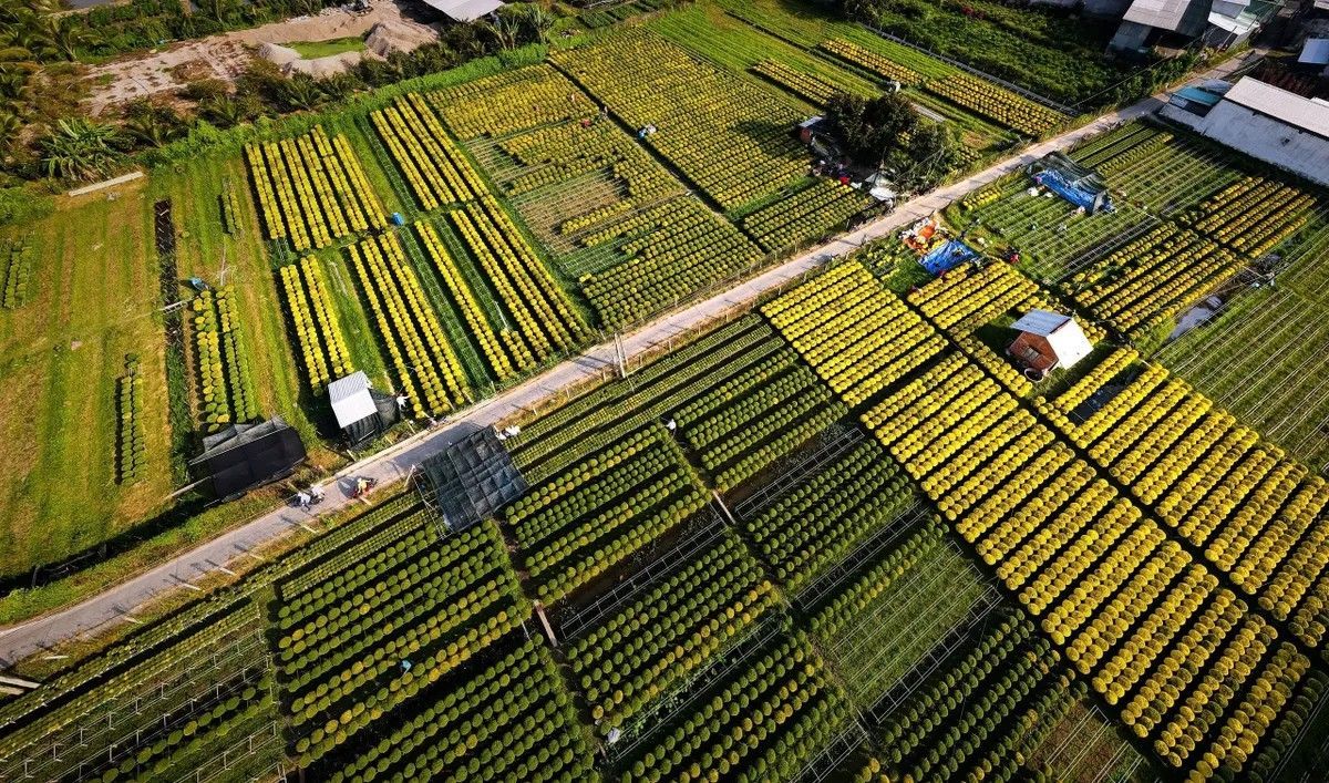 Known throughout Vietnam for its sweet, bright orange mandarins, Lai Vung (Dong Thap) becomes a sensation during Tet. The tangerine gardens here are among the most beautiful in the Delta, glowing with rows of heavy fruit-laden branches.